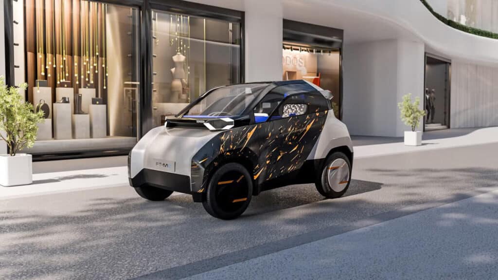 Imagen de un coche compacto futurista, el Toyota FT-M, estacionado frente a una moderna tienda con grandes ventanales. El coche presenta un diseño elegante en colores blanco y negro, con detalles en naranja y un patrón decorativo que recuerda a chispas en el lateral. La escena está iluminada con luz diurna, destacando el entorno urbano contemporáneo.
