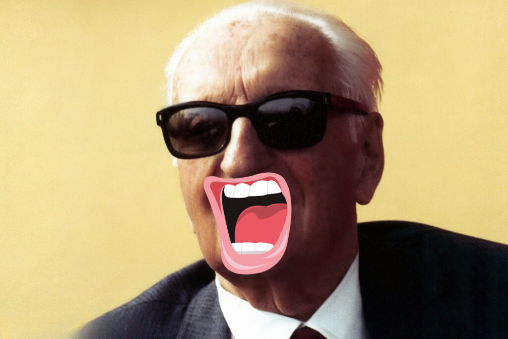 Retrato de Enzo Ferrari, fundador de la marca Ferrari, vestido con un traje oscuro, camisa blanca y corbata roja. En su rostro se le ha dibujado una boca enorme, al estilo de dibujo animado, que transmite la idea de que era un gran hablador o 'bocazas'. El fondo amarillo resalta aún más la caricatura en su expresión.