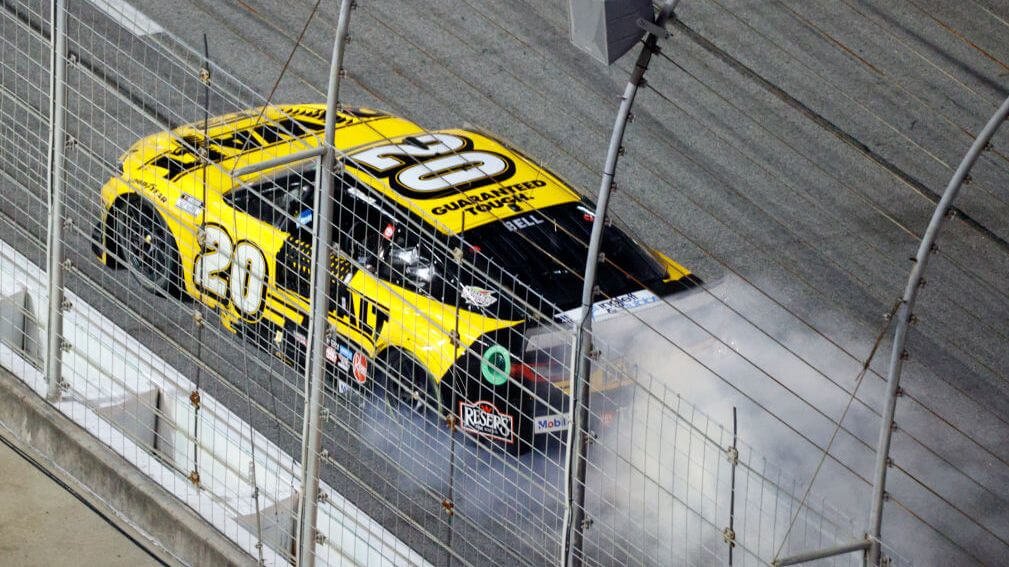 Un coche de carreras NASCAR amarillo con el número 20 y el nombre 'BELL' en el techo se ve en una pista de carreras. El coche está emitiendo una gran cantidad de humo desde la parte trasera, lo que indica un posible problema mecánico o un accidente. El coche está detrás de una cerca de seguridad y la superficie de la pista es visible. El coche tiene varios logotipos de patrocinadores, incluyendo 'Guaranteed Rate' y 'Rheem.'
