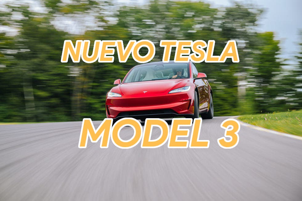 La imagen muestra un Tesla Model 3 rojo conduciendo en una carretera curva con un fondo borroso de árboles, lo que indica movimiento. El texto "NUEVO TESLA MODEL 3" se muestra de manera prominente en letras grandes, amarillas y en negrita con un contorno blanco, sugiriendo que esta es una imagen promocional o publicitaria para el nuevo Tesla Model 3 2024.