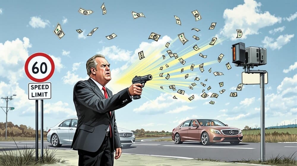 Ilustración satírica que representa el concepto de "atraco legal". Un político en traje negro y corbata roja apunta con una pistola (símbolo del robo) hacia un radar de velocidad, del cual salen volando billetes, sugiriendo que los radares son un método de recaudación forzosa. En la carretera hay dos Mercedes-Benz, objetivos potenciales de las multas, junto a una señal de límite de 60 km/h. El cielo azul con nubes y el paisaje rural contrastan con la dureza del mensaje: la crítica al uso de los radares como forma institucionalizada de recaudar dinero de los ciudadanos, representada como un atraco a mano armada por parte de la administración pública.