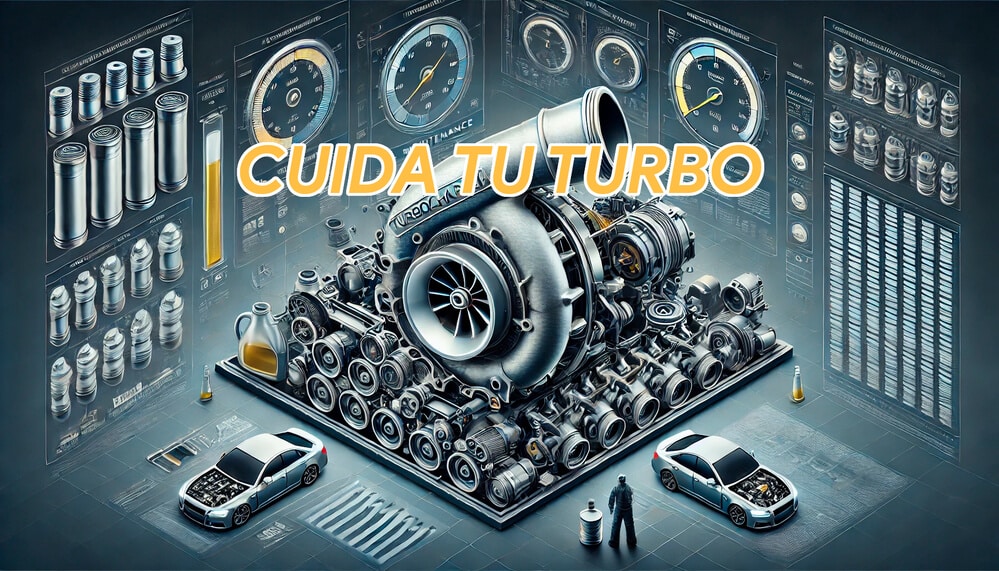 La imagen muestra un gran turbo de automóvil en el centro, rodeado de varias piezas de motor y componentes mecánicos. En el fondo, hay paneles con gráficos y medidores relacionados con el mantenimiento y el rendimiento del motor. Dos automóviles están situados en la parte inferior de la imagen, uno a cada lado del turbo. En la parte superior, hay un texto grande que dice 'CUIDA TU TURBO'. La imagen parece ser una ilustración técnica que enfatiza la importancia del cuidado y mantenimiento del turbo en los vehículos.