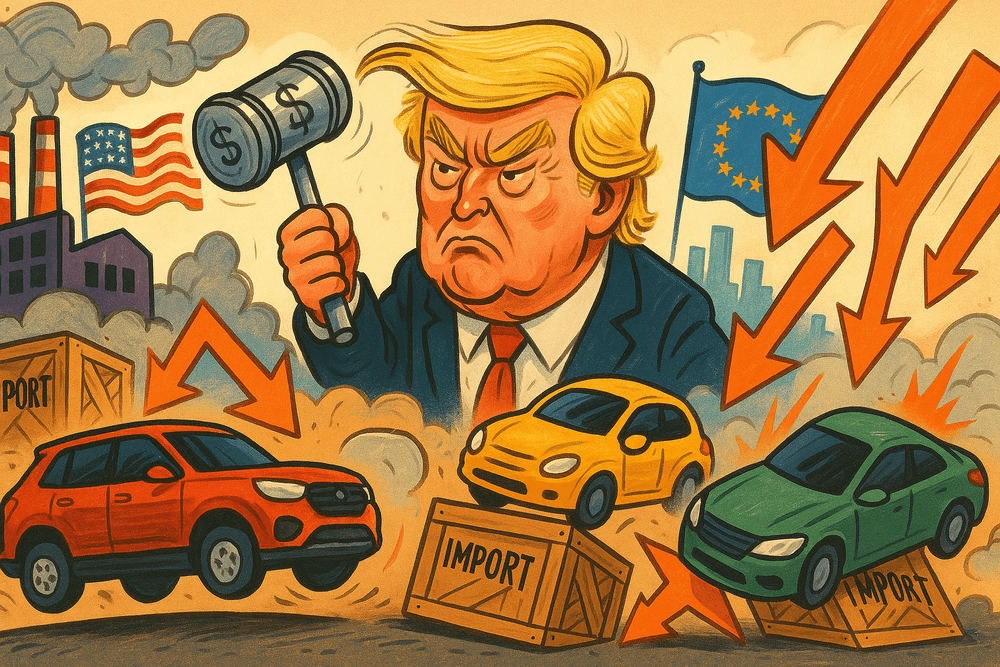 La ilustración muestra una figura central con cabello rubio, traje azul y corbata roja (Donald Trump), sosteniendo un mazo con el símbolo del dólar. Su rostro está censurado. A la izquierda, se ve una fábrica con chimeneas humeantes y una bandera de Estados Unidos ondeando. A la derecha, aparece una bandera de la Unión Europea. En la parte inferior, hay tres coches de colores rojo, amarillo y verde sobre cajas de madera etiquetadas como 'IMPORT'. Flechas rojas apuntan hacia abajo, simbolizando un impacto negativo. La imagen representa las políticas de aranceles de Trump y su efecto en la industria automotriz y el comercio internacional.