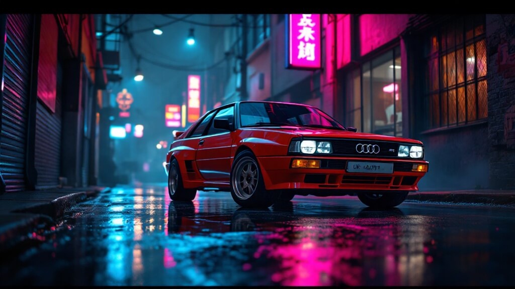 "Un Audi Ur-Quattro rojo está estacionado en una calle urbana oscura y mojada. Luces de neón brillantes en tonos rosados y azules iluminan el entorno, reflejándose en el pavimento húmedo. En el fondo, edificios con letreros en caracteres chinos aportan un ambiente futurista y nocturno. El coche, con su diseño deportivo y clásico, destaca en el centro de la escena.