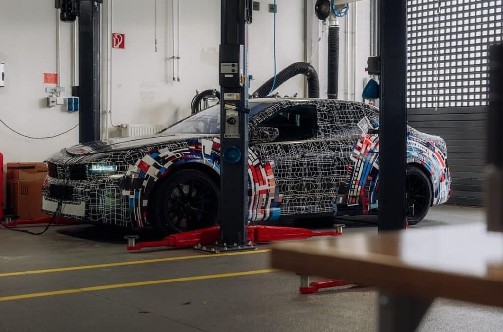BMW M3 eléctrico en un taller de pruebas, elevado sobre una plataforma hidráulica roja. El espacio muestra equipamiento técnico y señales de seguridad en las paredes. El camuflaje del vehículo permite apreciar su silueta deportiva y sus elementos aerodinámicos