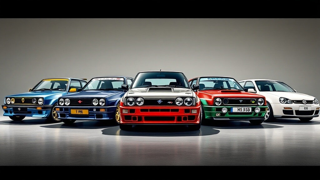 Imagen de cinco coches hot hatch alineados que son los deportivos compactos míticos. De izquierda a derecha: un Renault azul con detalles amarillos, un Subaru azul oscuro con llantas doradas, un Peugeot negro y rojo con la insignia 'T16S', un Lancia verde y rojo con techo blanco y matrícula 'HS 50', y un Volkswagen Golf blanco con la insignia 'G60'.