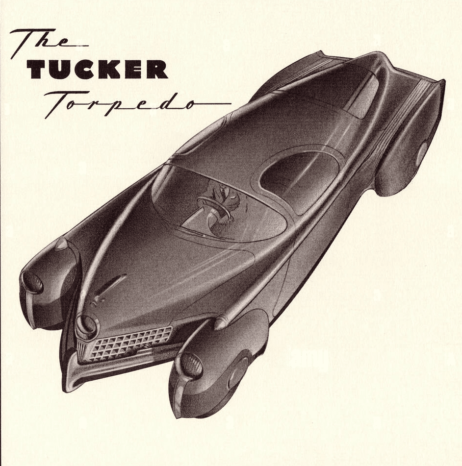 La imagen muestra un dibujo en blanco y negro de un automóvil antiguo con diseño futurista denominado “The Tucker Torpedo”. El vehículo tiene líneas aerodinámicas, una carrocería alargada y lisa con guardabarros prominentes que cubren las ruedas delanteras y traseras. En el centro del capó hay un faro circular. La tipografía sobre el dibujo tiene un estilo clásico y anuncia el nombre del automóvil.
