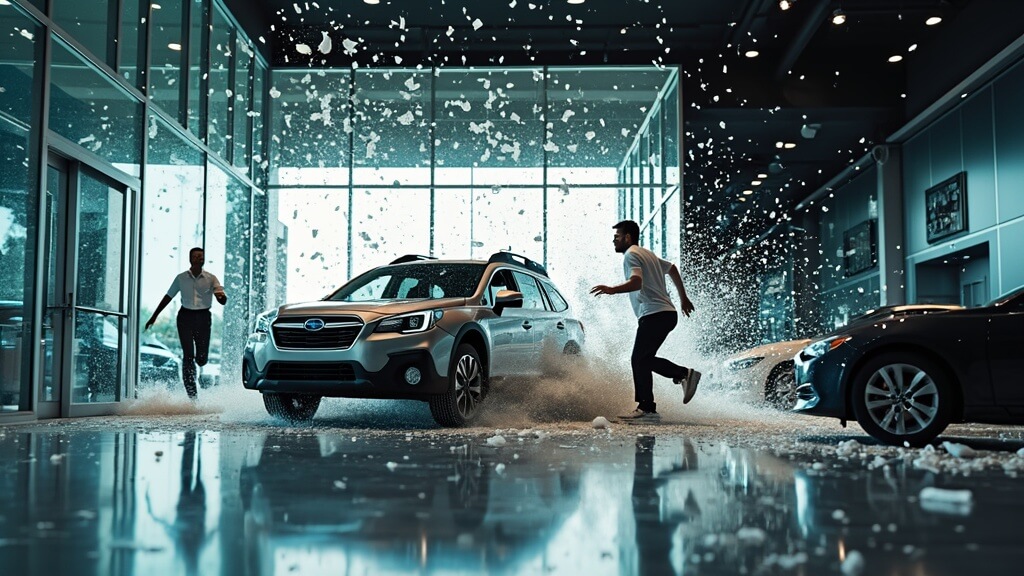 Una escena dramática dentro de un concesionario de coches: un Subaru Outback gris atraviesa a toda velocidad una fachada de cristal, con fragmentos de vidrio volando por el aire. Dos hombres corren para esquivar el impacto, mientras el coche se detiene en el suelo brillante del showroom, rodeado de caos. La iluminación del concesionario resalta los detalles del incidente, con coches expuestos a la izquierda y el ambiente lleno de tensión y movimiento.