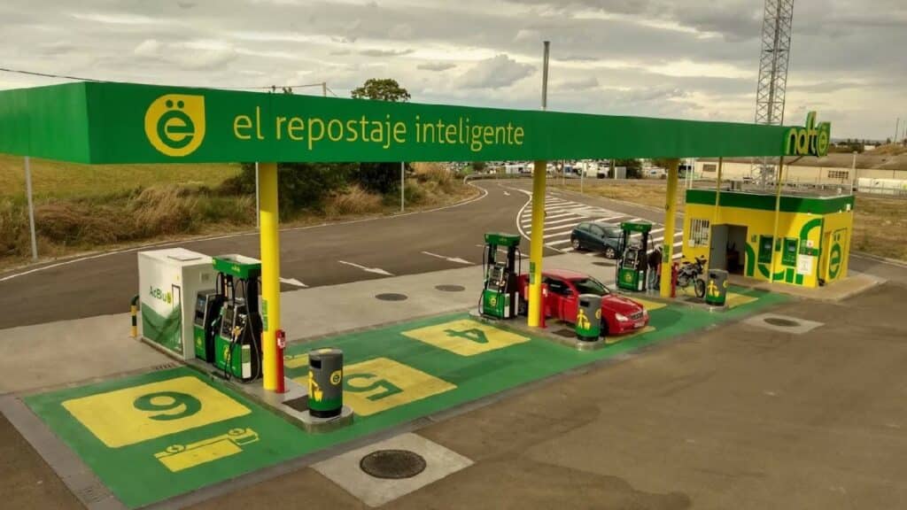 Imagen de una gasolinera Nafte en Zaragoza, denominada ‘el repostaje inteligente’, ubicada en la carretera del aeropuerto de Zaragoza. La estación tiene un techo rectangular grande y plano con el logotipo de Nafte en color verde y amarillo. Debajo hay varias bombas de combustible sobre una superficie de asfalto con marcas verdes y amarillas. A la derecha, hay una estructura pequeña con más logotipos y colores corporativos que podría ser una tienda o área de servicio. En el fondo, se observa un cielo parcialmente nublado y vegetación baja junto a infraestructuras eléctricas.