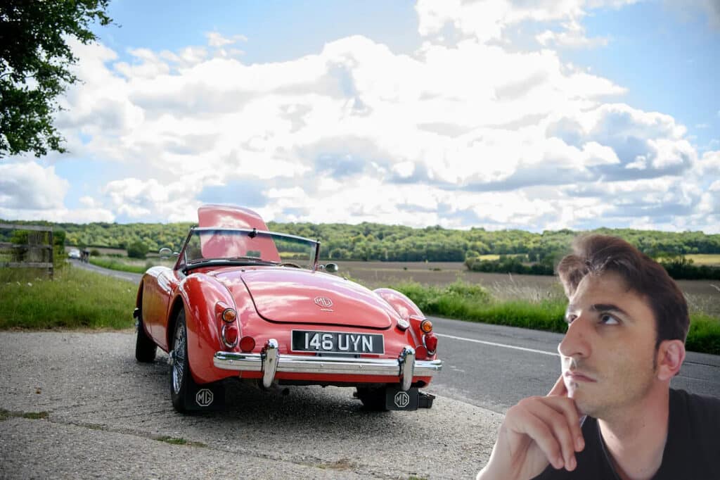 Coche MG clásico rojo con matrícula ‘146 UYN’ en carretera rural, paisaje verde al fondo, cielo parcialmente nublado. En primer plano, cara de autor pensativo superpuesta.