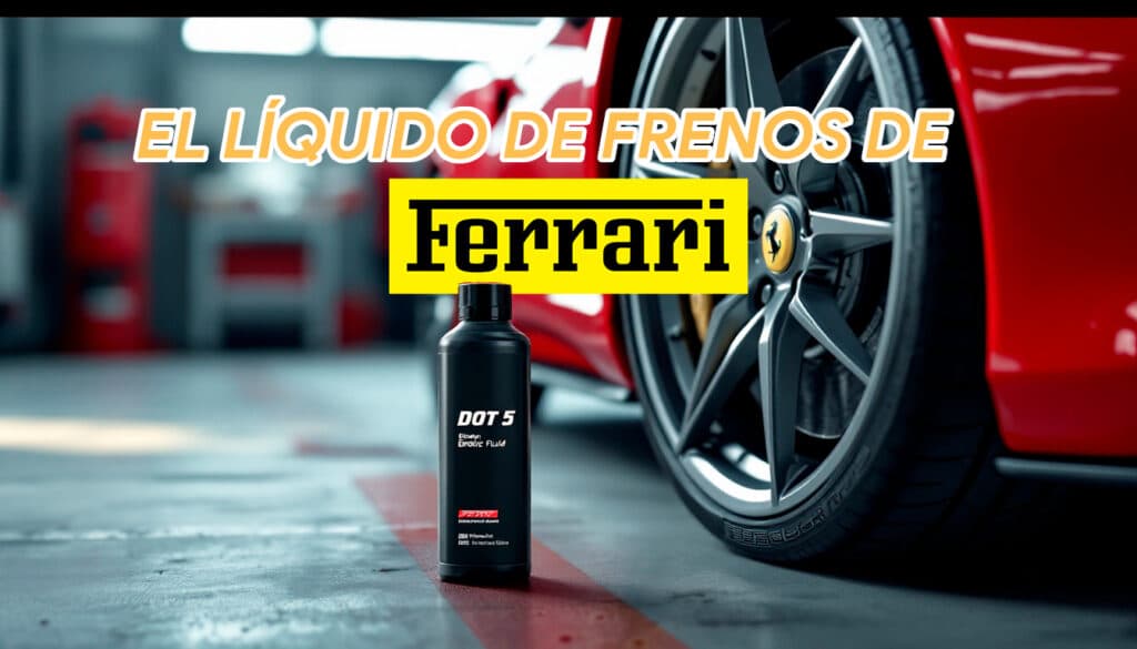 Imagen de un producto de líquido de frenos marca Ferrari, con la etiqueta “DOT 5” en primer plano. Al fondo, se observa parcialmente un vehículo deportivo rojo con el logotipo de Ferrari en el centro de la rueda. La escena tiene lugar en un taller o garaje con iluminación tenue y suelo gris. Líquido de frenos DOT 5.
