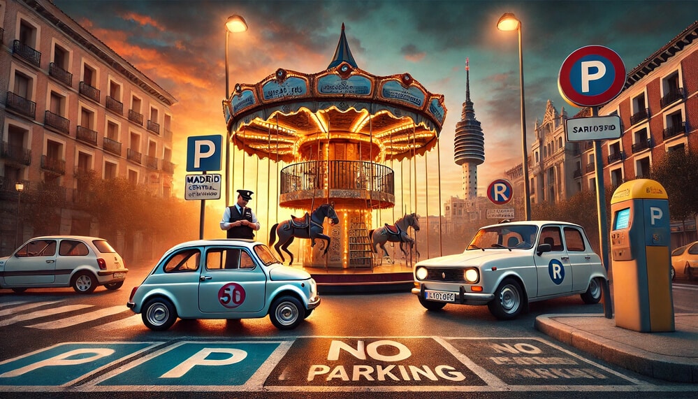 La imagen muestra una escena urbana vibrante al anochecer con un carrusel en el fondo, rodeado de coches clásicos y varias señales de aparcamiento. El carrusel está iluminado brillantemente, creando una atmósfera cálida y acogedora. En primer plano, hay dos coches antiguos, uno con un cartel de '50' y otro con una señal de 'R'. Se pueden ver un parquímetro y varias señales de aparcamiento con la letra 'P', junto con una marca de 'NO PARKING' en la calle. El entorno parece estar en Madrid, como lo indica un cartel que dice 'MADRID CENTRAL DE VIVIENDO'. La imagen es interesante debido a su sensación nostálgica, combinando elementos clásicos con infraestructura urbana moderna.
