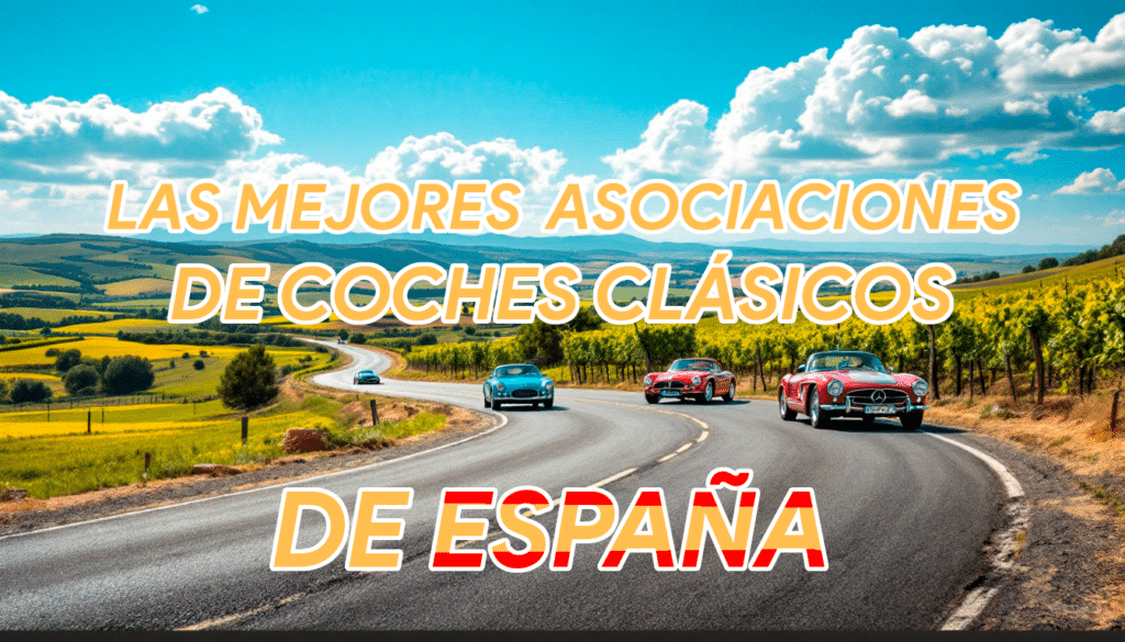 Imagen de tres coches clásicos en movimiento en una carretera rodeada de campos verdes y colinas bajo un cielo azul con nubes dispersas. En la parte superior, un texto dice ‘LAS MEJORES ASOCIACIONES DE COCHES CLÁSICOS’ y en la parte inferior ‘DE ESPAÑA’. El paisaje sugiere que podría ser una región rural de España. La imagen destaca por el contraste entre los vehículos vintage coloridos y el paisaje natural.
