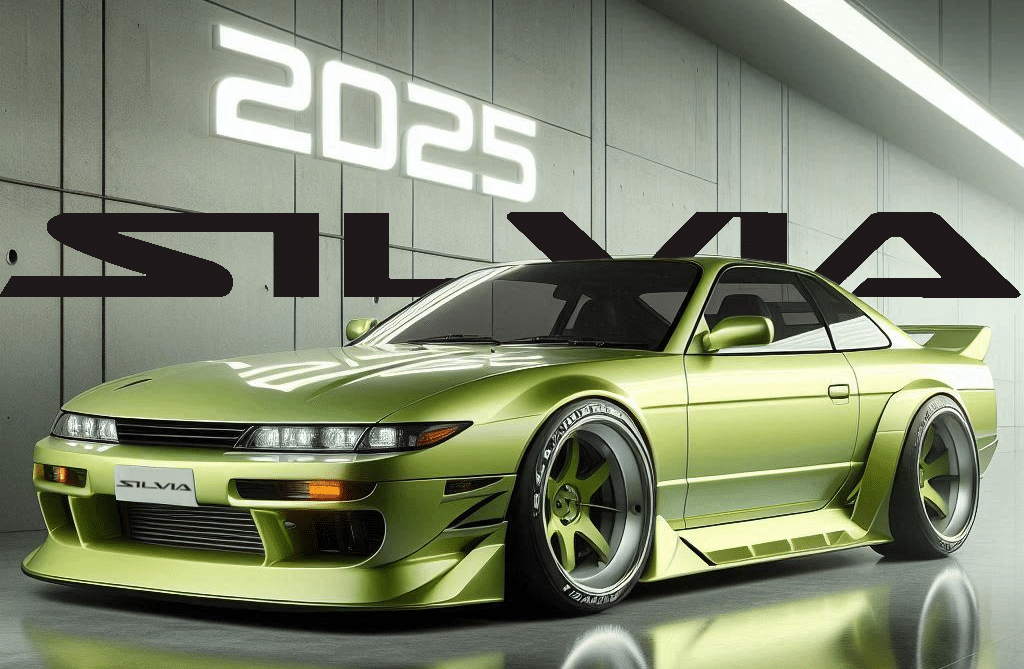Concepto del Nissan Silvia 2025 diseñado por JM Miana con ayuda de la IA. El coche deportivo, de color verde, está equipado con un kit de carrocería y estacionado frente a una pared con las inscripciones ‘2025’ y ‘SILVIA’. La imagen sugiere un rediseño futurista o conceptual del modelo clásico, posiblemente para el año 2025.