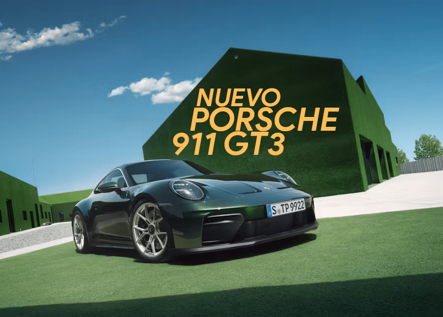 Imagen de un automóvil deportivo Porsche 911 GT3 de color verde oscuro, estacionado frente a un edificio moderno también de color verde. El cielo es azul claro con algunas nubes dispersas. En la parte superior del automóvil, hay texto en amarillo que dice ‘NUEVO PORSCHE 911 GT3’.