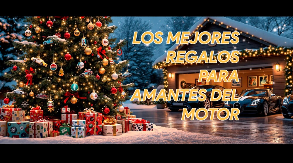 La imagen muestra una escena festiva de Navidad con un árbol de Navidad decorado y numerosos regalos envueltos colocados debajo. El árbol está adornado con varios adornos, incluidos coches en miniatura y decoraciones temáticas automotrices. En el fondo, hay un garaje con dos coches de lujo estacionados frente a él, y el garaje también está decorado con luces navideñas. El entorno es nevado, lo que añade al ambiente festivo. El texto en la imagen dice: "LOS MEJORES REGALOS PARA AMANTES DEL MOTOR." Esta imagen es interesante y relevante ya que sugiere que los regalos bajo el árbol son ideales para los entusiastas de los coches.