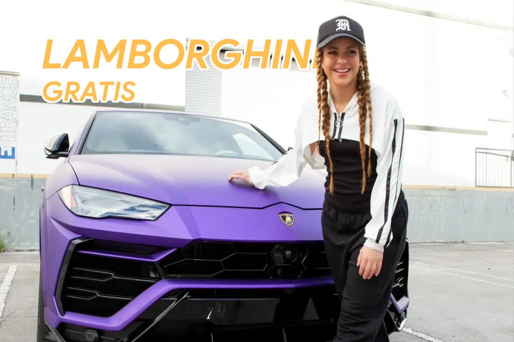 La imagen muestra a Shakira de pie junto a un Lamborghini Urus morado. Shakira lleva un atuendo en blanco y negro y una gorra negra. El texto en la imagen dice 'LAMBORGHINI GRATIS', lo que sugiere que se está promocionando un sorteo o concurso en el que se puede ganar un Lamborghini.